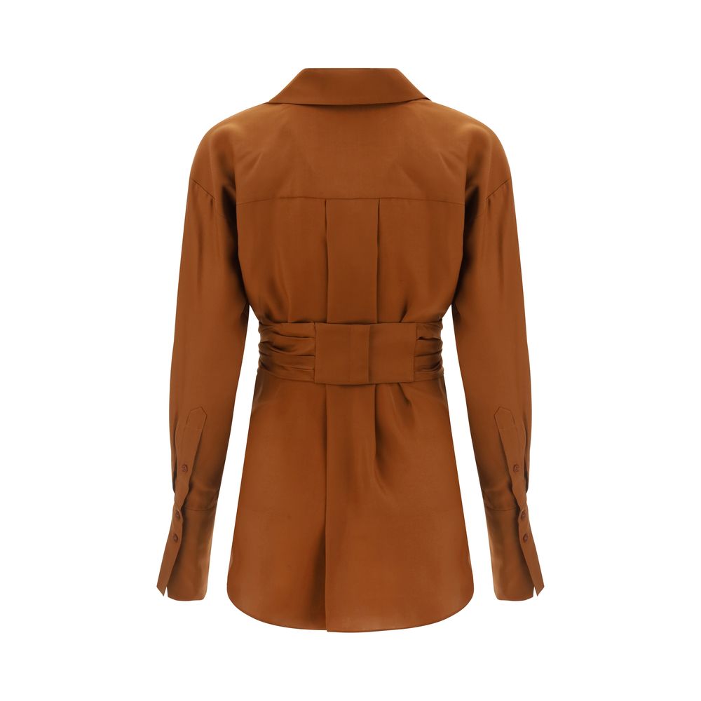Chemise Silk Sabinas de Gauge81, col bas, coupe courte monochrome sur le devant, fermeture sur le devant par crochets invisibles, fentes latérales rondes, poignets ajustables avec boutons gravés de la signature emblématique de la marque.
