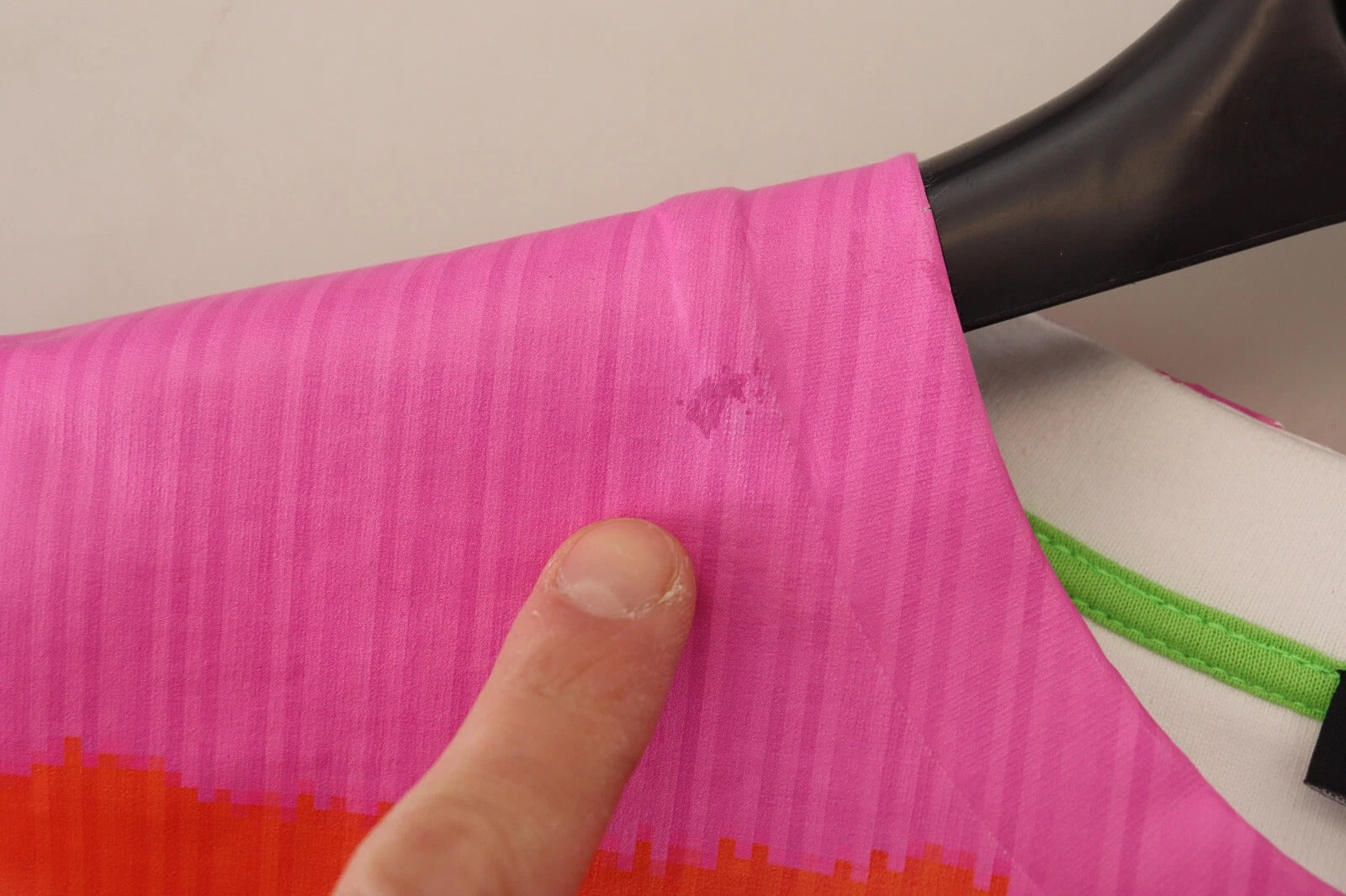 This item has a minor defect, there is some color fade on the collar area (see pictures).